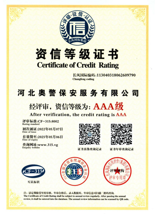 河北奧警保安服務有限公司河北奧警保安服務有限公司成立于2017年7月20日,注冊資金1000萬元,具有中華人民共和國《保安服務許可證》(編號:冀公保服20180085)的綜合性安保企業。